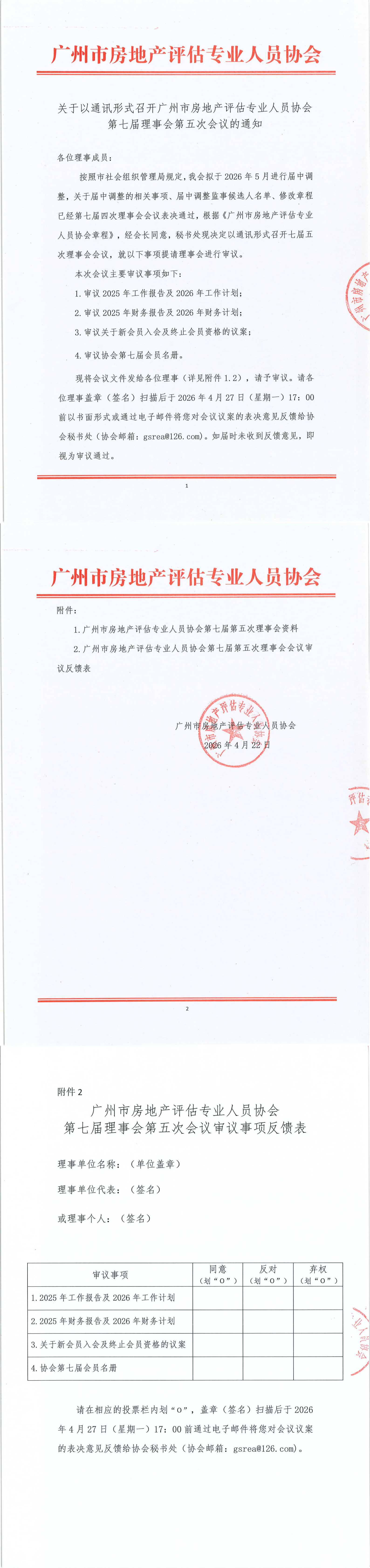 关于以通讯形式召开广州市房地产评估专业人员协会第七届理事会第五次会议的通知